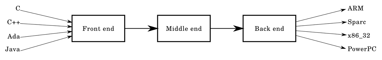 일반적으로 프런트 엔드(front end)는 소스 코드를 분석하여 프로그램의 내부 표현인 중간 표현(Intermediate Representation, IR)을 구축합니다.