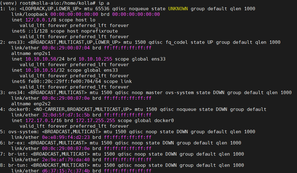 - => 관리망(ens33)과 외부망(ens34)를 분리하여, 호스트 OS와 kolla-ansible 컨테이너가 서로 간섭 없이 각자의 네트워크 역할을 수행하도록 하여 설치 성공.