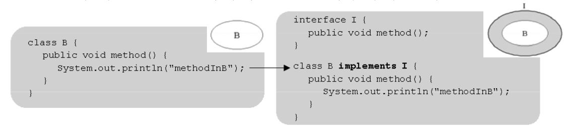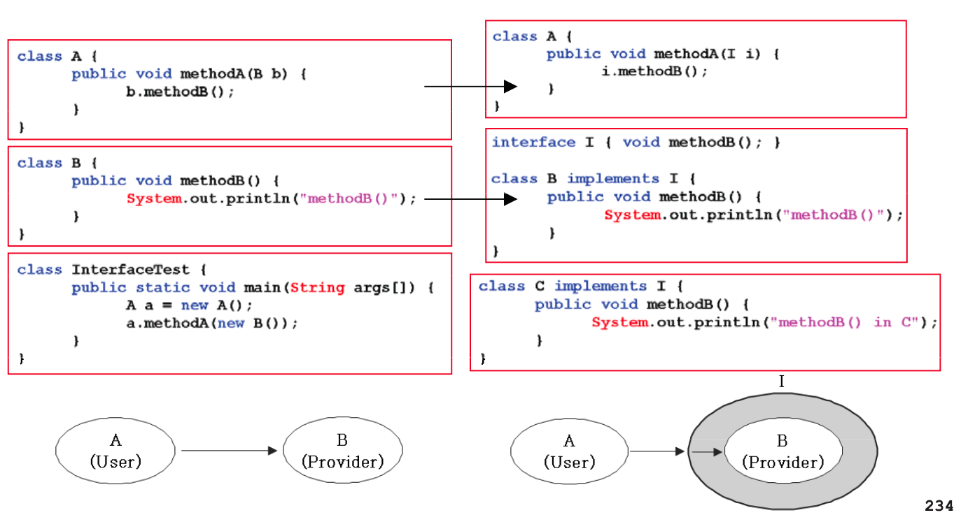 인터페이스를 사용하는 오른쪽은 A-I-B 형태로 A와 B가 직접적으로 연결되어 있지 않고 인터페이스를 거치게 되어 B가 바뀌어도 A를 바꾸지 않아도 되는 느슨한 결합으로 연결되어 있다.