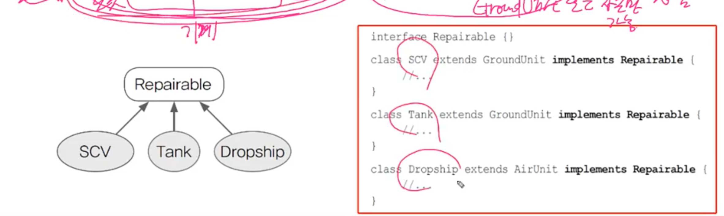 Repairable 인터페이스를 만들어 관계가 없던 클래스 간에 관계를 맺어주었다.