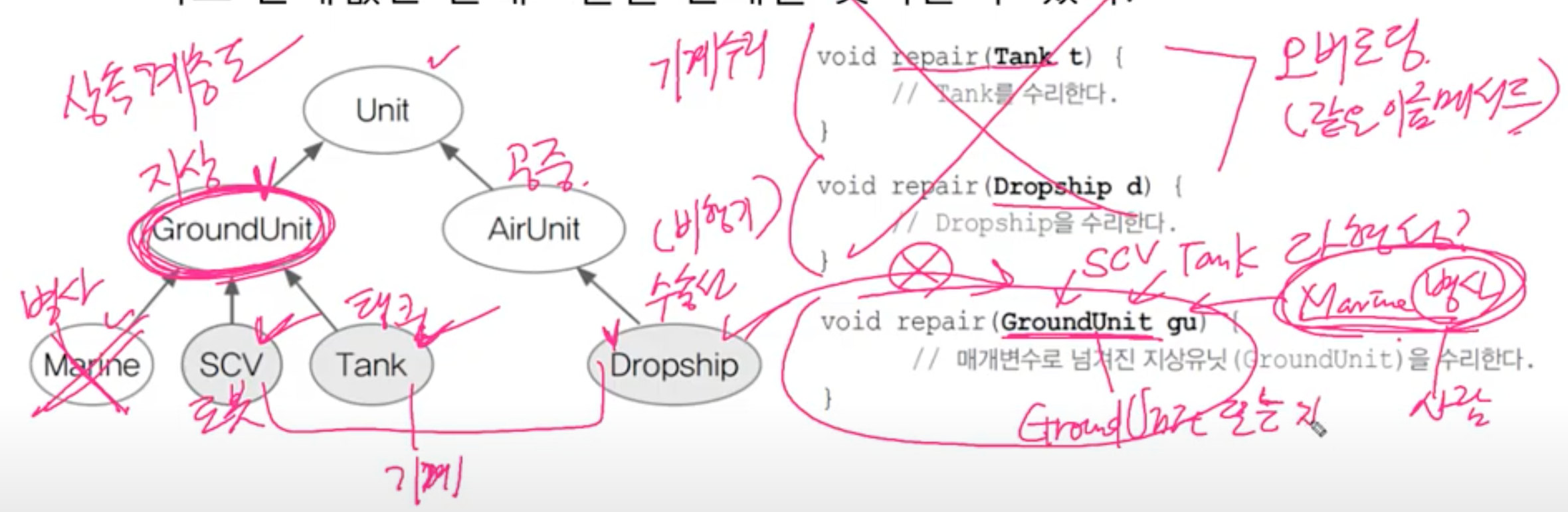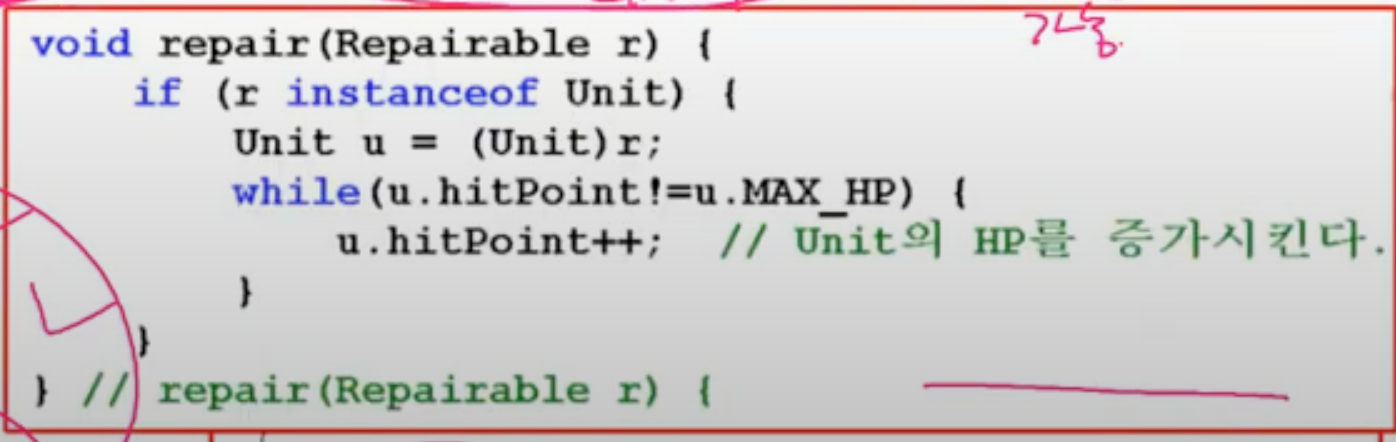 그리고 repair메서드를 오버로딩할 필요 없이, 인터페이스를 매개변수로 사용하는 메서드를 만들어 주면 된다.