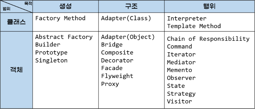 GoF 패턴은 크게 목적과 범위에 따라 구분되는데,