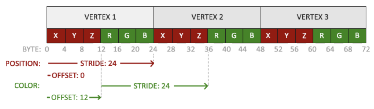 위와 같이 vertex attribute를 추가하였고 VBO memory를 수정했으므로 vertex attribute pointer를 재설정해야한다. 업데이트된 VBO 메모리는 아래와 같을 것이다.