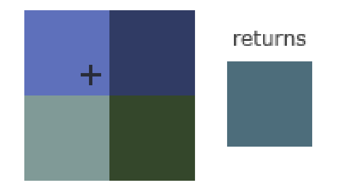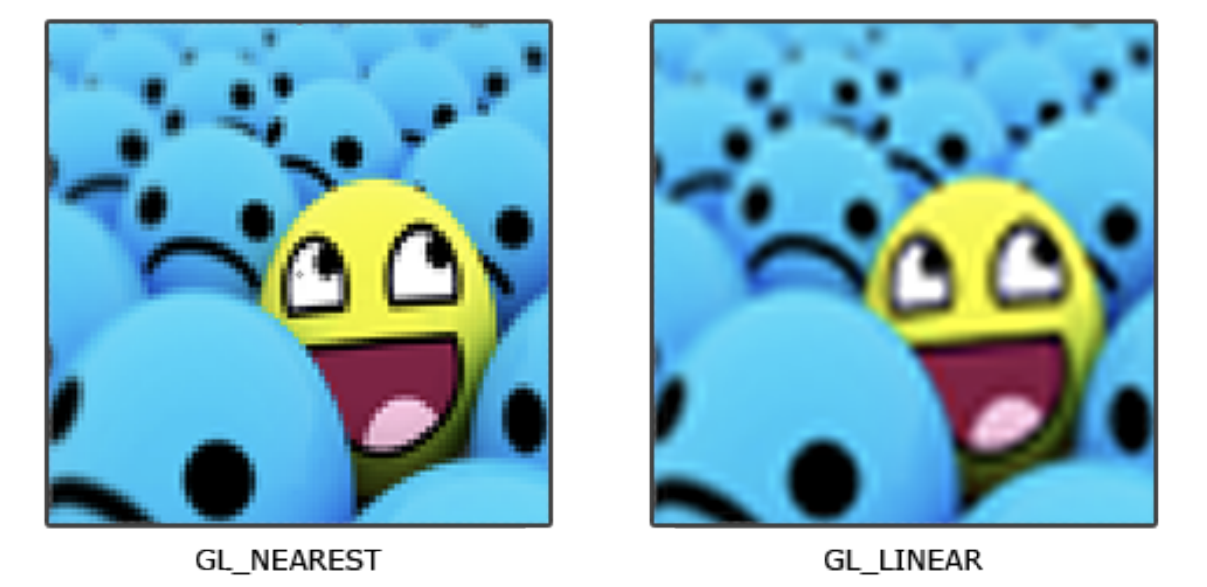 GL_LINEAR((bi)linear 필터링이라 알려져있다) 는 텍스쳐 좌표의 이웃 texel들로부터 보간된(interpolated) 값을 가진다. texels 간 색상값을 근사치를 낸다.