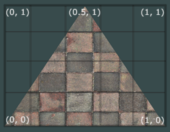 texture coordinate의 범위는 x와 y축에서 0부터 1까지이며 texture coordinate을 사용하여 texture 색상을 찾는 것을 샘플링이라고 한다. 텍스쳐 좌표계에서 (0, 0)은 텍스쳐 이미지의 좌하단 모서리이고 (1, 1)은 우상단 모서리이다.