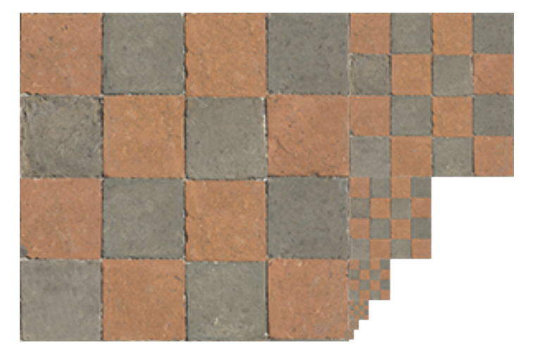 이러한 문제를 해결하기위한 것이 mipmaps이다. mipmaps는 텍스쳐 이미지들을 모아놓은 것인데 그 이미지들은 서로 다른 사이즈를 가진 똑같은 이미지들이다. 각 이미지들은 이전 이미지들의 사이즈 두배 작은 것들이다.