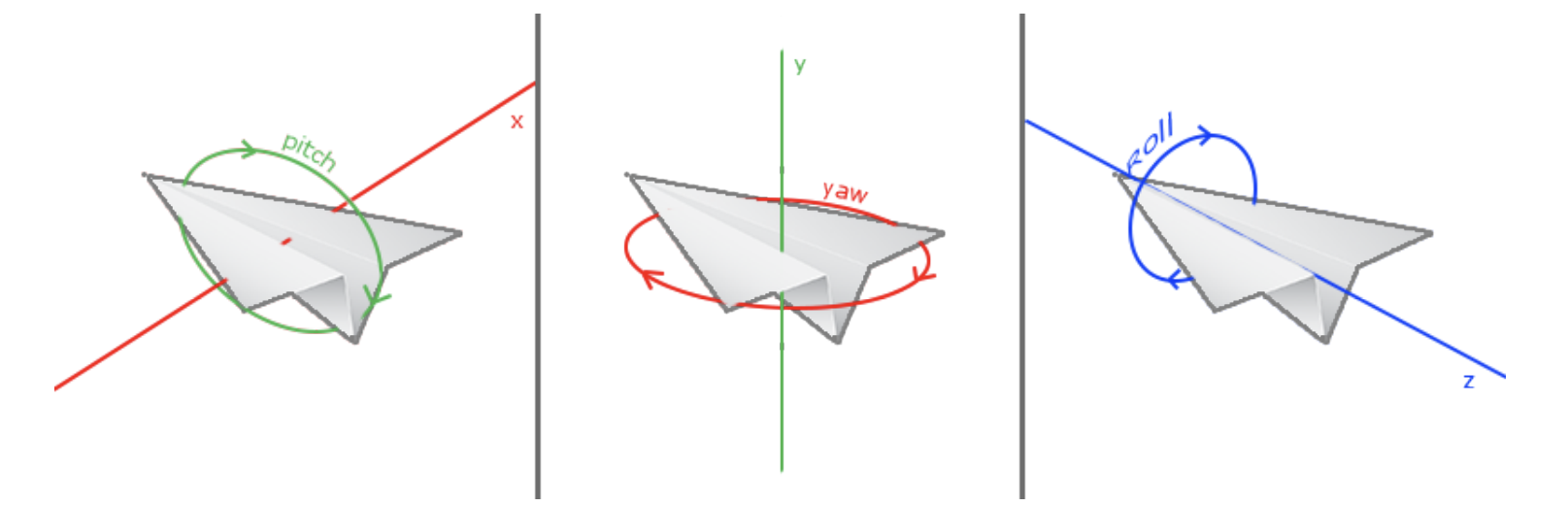 pitch 각은 어느 정도로 아래와 위를 볼 것인지 묘사하고 yaw는 좌우의 정도를 나타내고 roll은 빙글 빙글 도는 정도를 나타낸다. 각각의 오일러각은 단일 변수에 의해 표현되며 세가지 모두 조합하여 3D에서 회전 벡터를 계산할 수 있다.