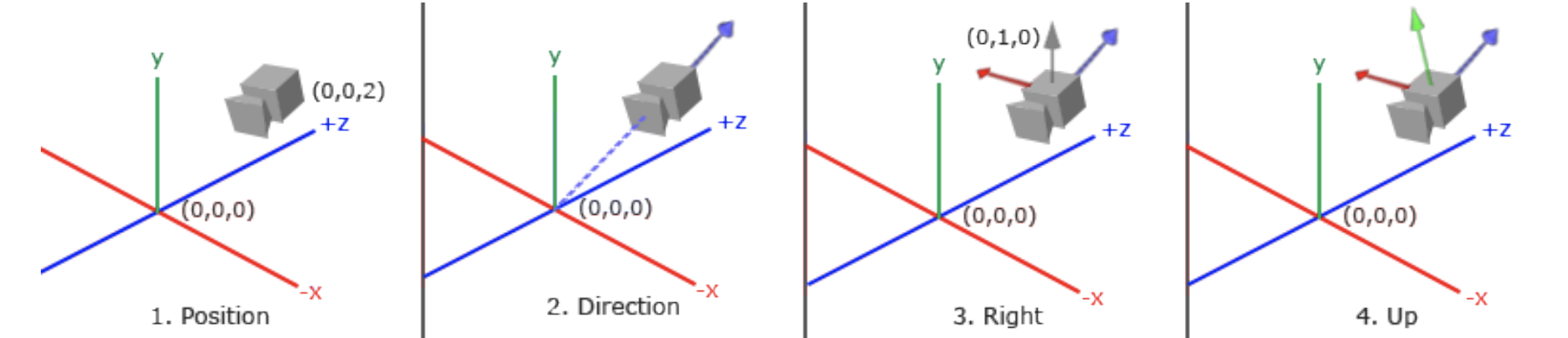 세 수직인 축을 사용하여 좌표 공간을 정의하면 그 세 축과 이동 벡터와 함께 행렬을 만들 수 있고 이 행렬을 곱하는 것으로 그 좌표 공간에 어느 벡터도 변환할 수 있다. 이것이 LookAt 행렬의 역할이고 지금 세 축과 카메라 벡터를 정의하는 지점으로 LookAt 행렬을 만들 수 있다.