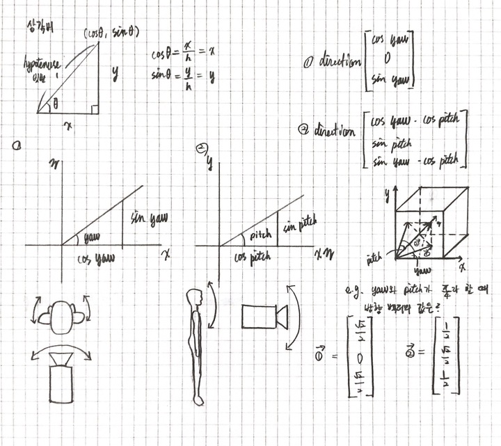현재 카메라 시스템에서 pitch와 yaw 값들만 신경쓰고 roll 값은 배제한다. 새로운 방향 벡터를 나타내는 3D 벡터에 주어진 pitch와 yaw 값을 변환한다. pitch와 yaw 값을 방향벡터로 변환하는 과정은 삼각함수를 요구.