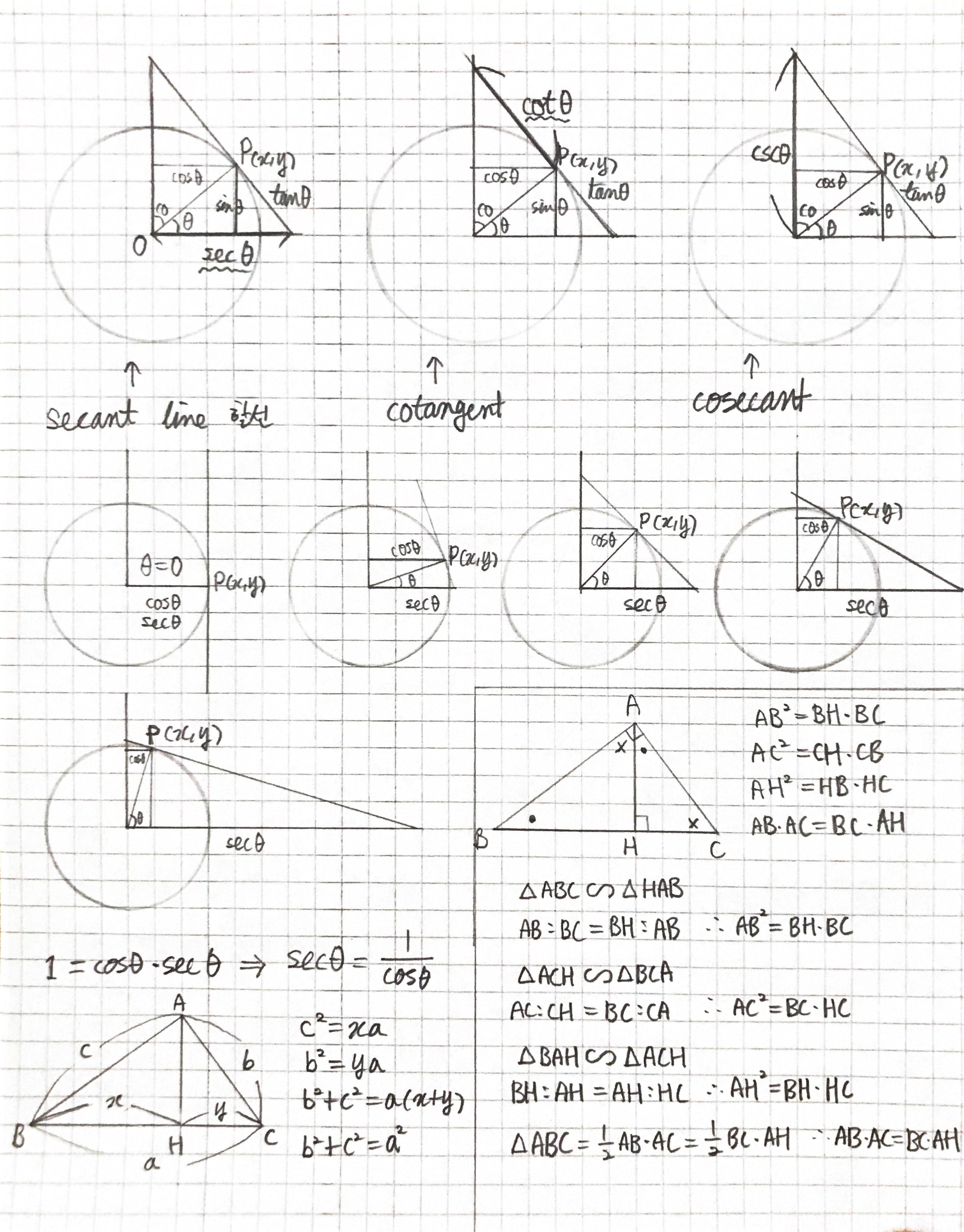 삼각함수 용어 설명, 역수관계인 삼각함수들, 사영정리 및 피타고라스 정리