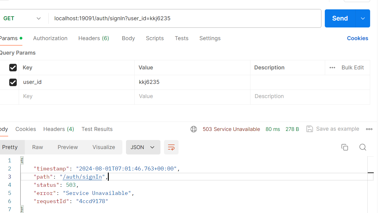게이트웨이에서 로그인을 요청하여 토큰을 발급받아보자 하지만 위처럼 503 에러가 나왔다. AuthService를 실행하지 않았거나 실행 순서가 다르면 서비스를 찾지 못하는 것이다. 순서를 잘 지키자~