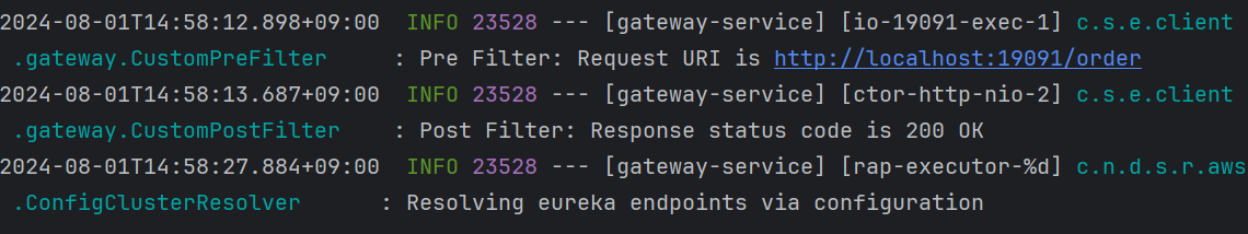 CustomPreFilter는 게이트웨이로 들어오는 HTTP 요청의 URI를 기록하며, 이 경우 요청된 URI는 http://localhost:19091/order였습니다. 그 후 요청이 처리되고 난 뒤, CustomPostFilter는 반환된 응답의 상태 코드를 기록했으며, 이 로그에서는 응답이 성공적으로 처리되었음을 나타내는 200 OK 상태 코드가 반환되었습니다.