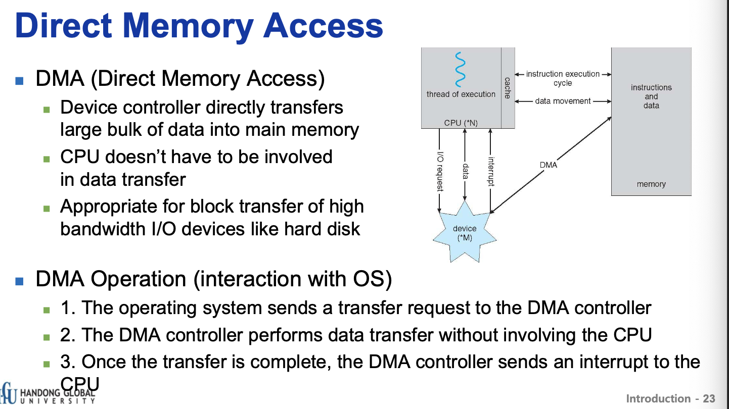 DMA란? 직접적으로 바로 메모리에 접근하는 방식이다. 다바이스가 바로 직접적으로 많은 양의 데이터를 메인 메모리로 보내는 행위이다. 그 과정에서 CPU는 간섭할 필요는 없다.