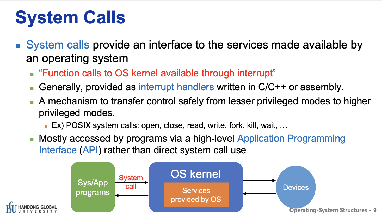 System call은 사용자가 운영체제 커널은 안전하게 사용할 수 있는 역할을 준다. 디스크 I/O나 프로세스 생성 같은 중요한 자원 접근은 커널을 통하여서 접근이 가능하다. 비특권 모드와 특권 모드의 문맥전환을 담당한다.