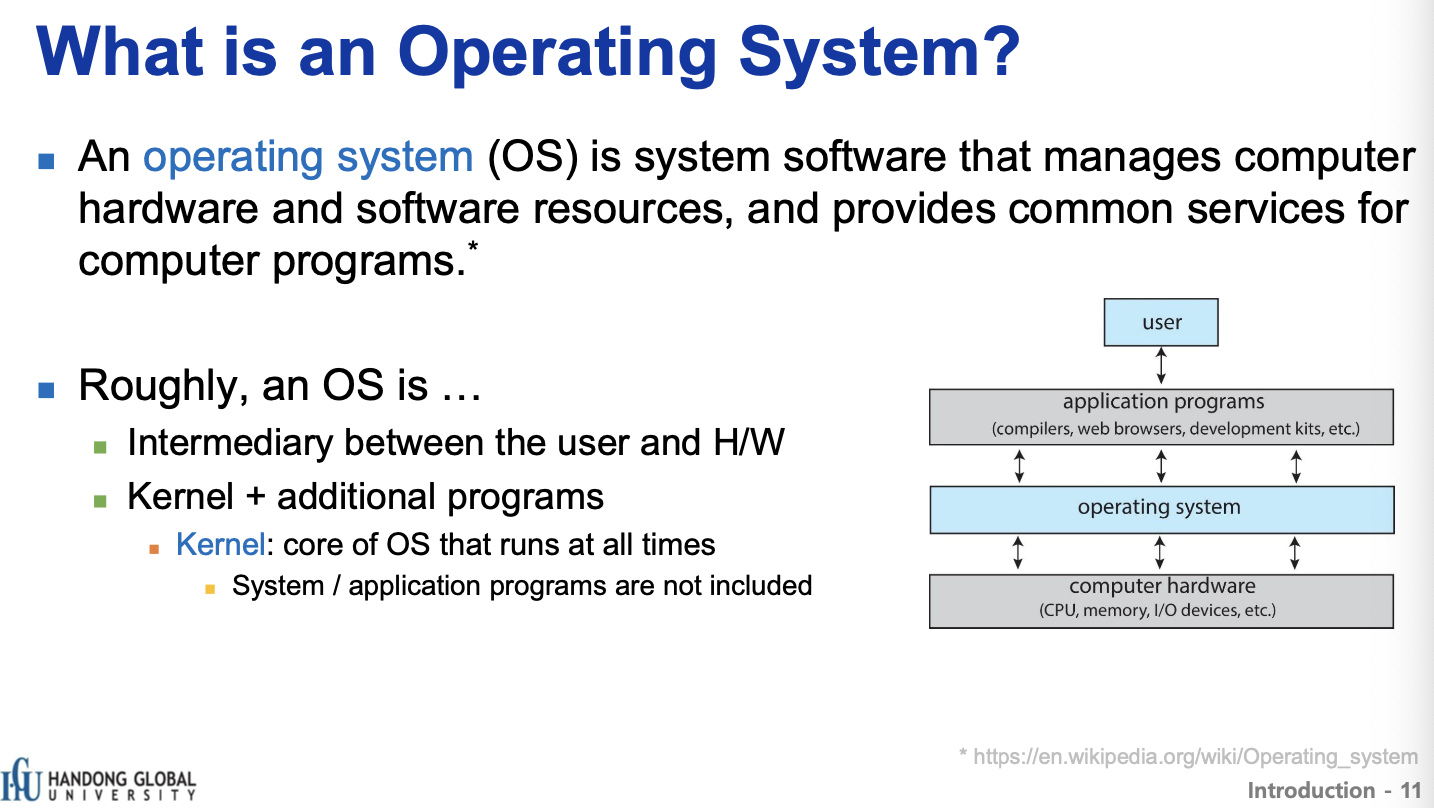 운영 체제란 하드웨어와 유저 사이의 소통을 가능하게 만들어주는 시스템 소프트웨어이다.