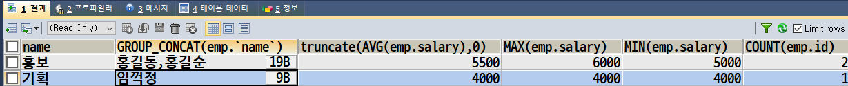 GROUP_CONCAT(컬럼) 그룹화된 데이터에 포함하고 있는 컬럼의 모든값 들을 모두 보여주는 함수