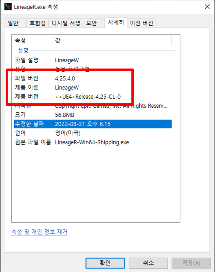예를 들어, 리니지W의 경우 제 컴퓨터에서 아래 파일의 속성을 확인했습니다.