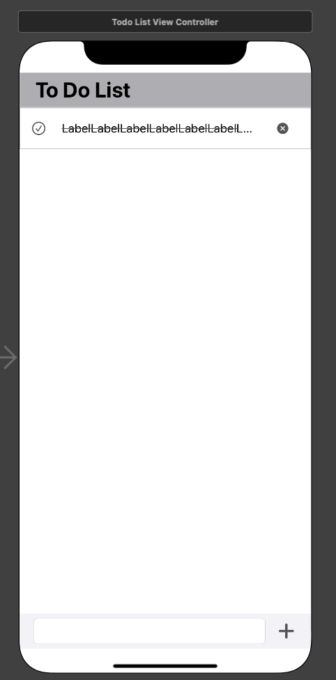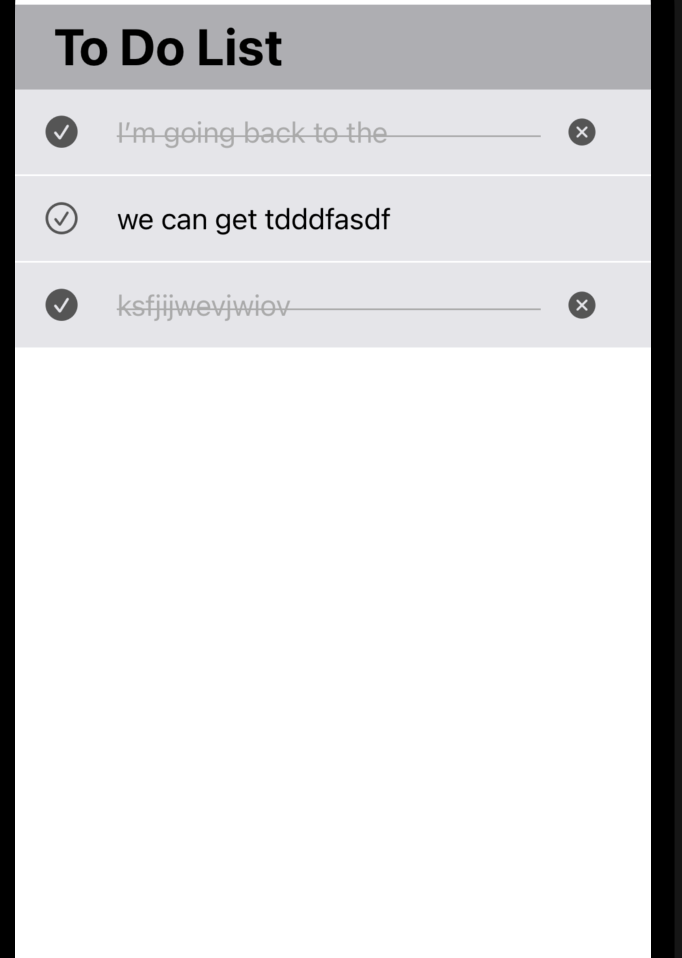 checkButton을 select했을때의 화면이다. 체크버튼은 색이 채워진 버튼으로 바꿔주었고, textLabel의 색을 연한 회색으로 바꿔주었다. 이때 높이 1의 추가적인 UIView를 이용하여 체크 버튼이 선택되었을때만 색과 bottom constraint를 변화시켜주어 보여주었다. 또한 deleteButton또한 체크버튼이 선택되었을 때에만 보여지도록 하였다.