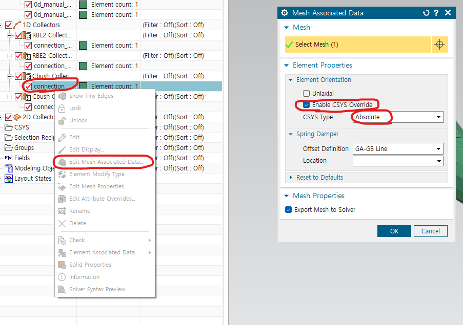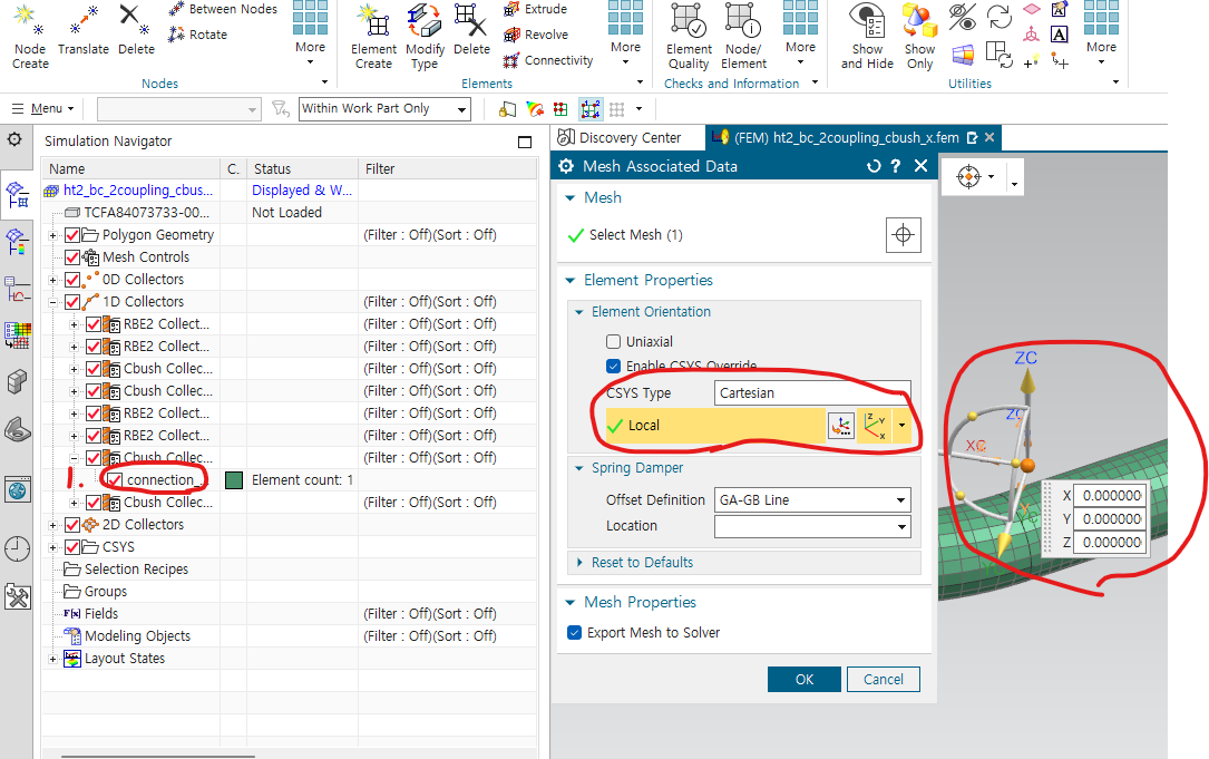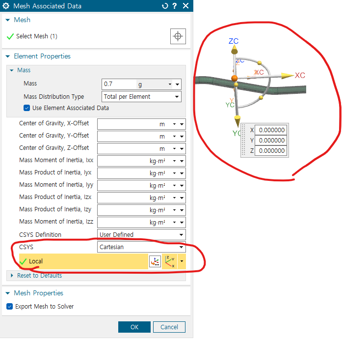 enable CSYS Override -> cartesian -> local 좌표계 생성