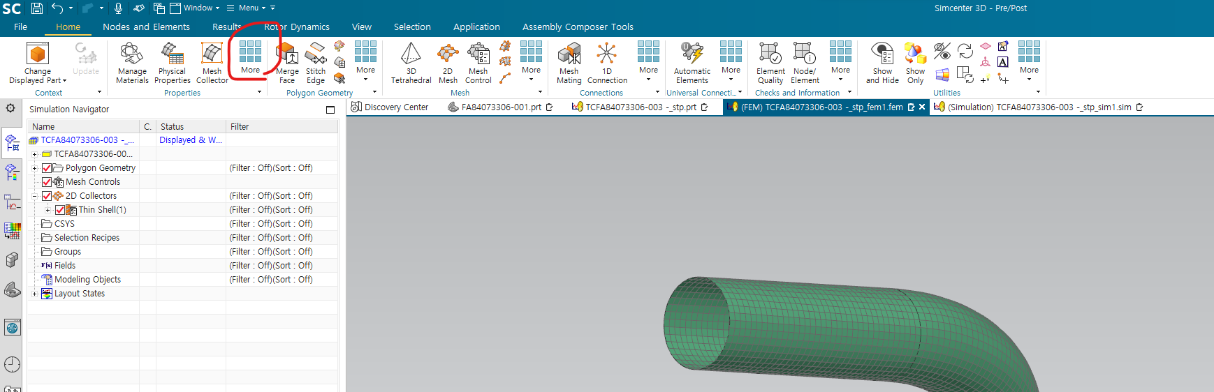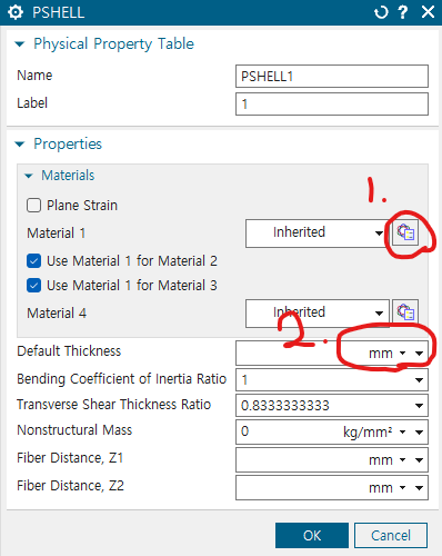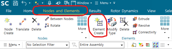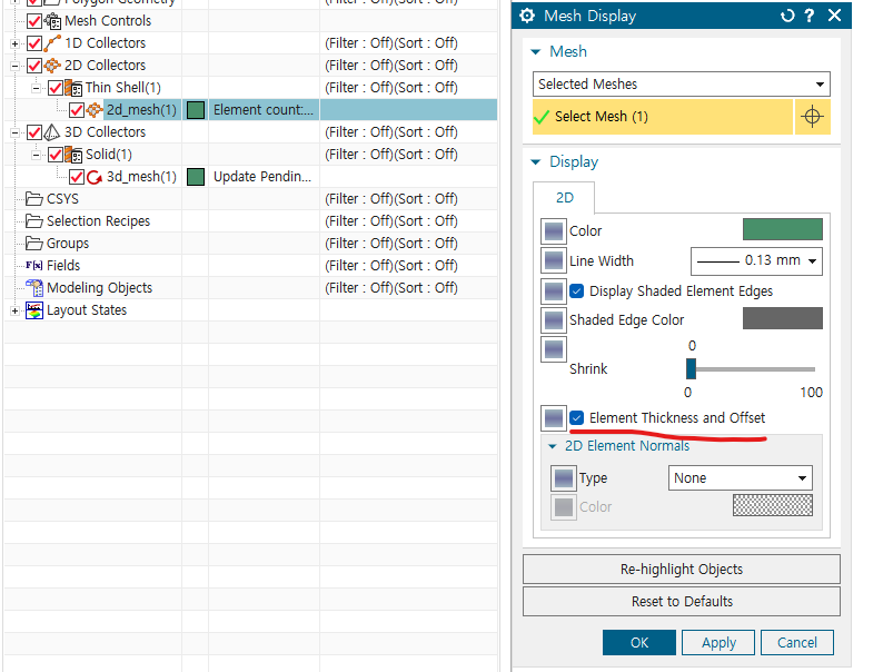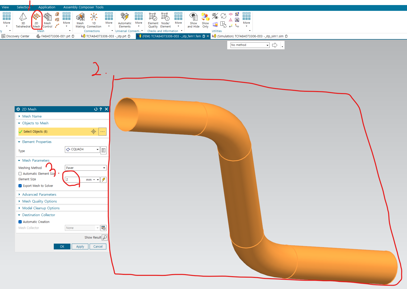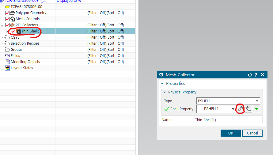 fem에 들어가서 mesh 생성 - 1. shell이므로 2D mesh 2. 드래그하여, mesh 생성하는 prt 선택 3. 원하는 element size 지정
