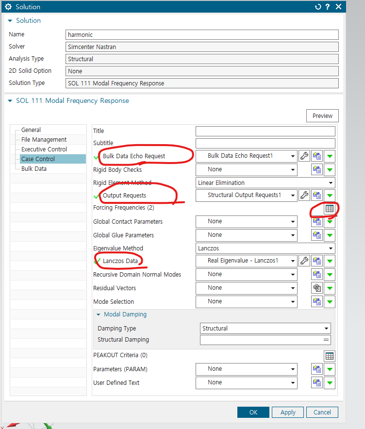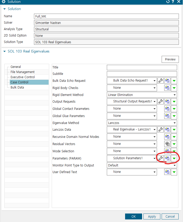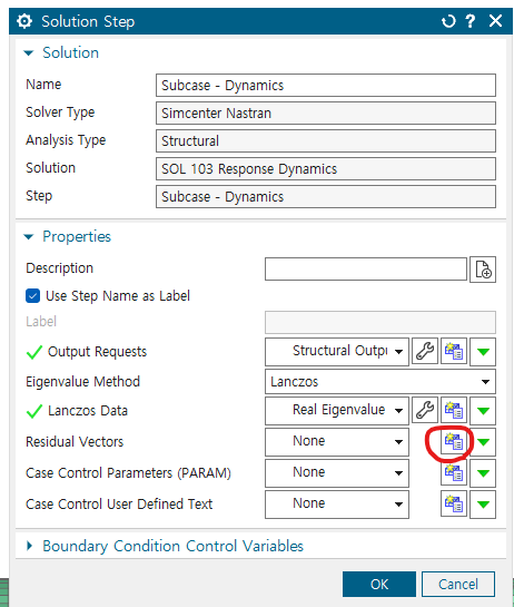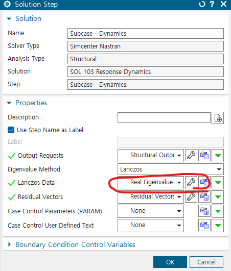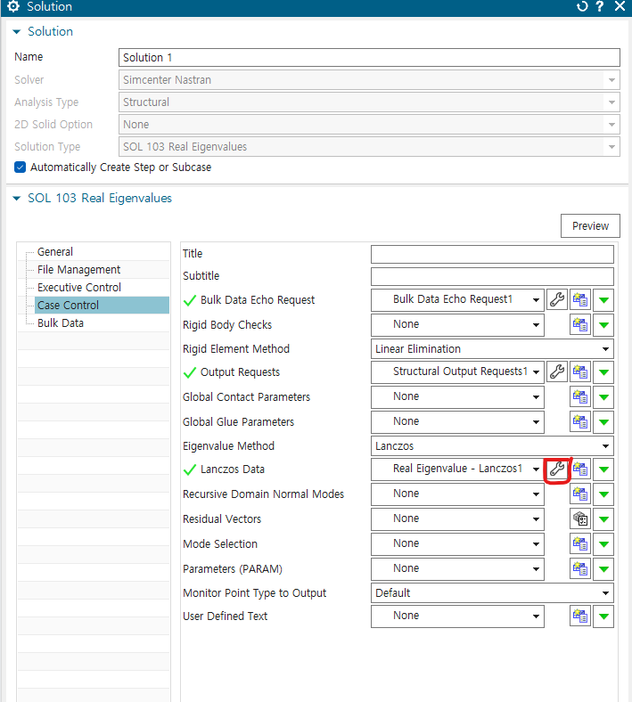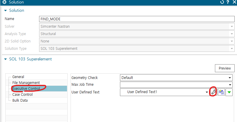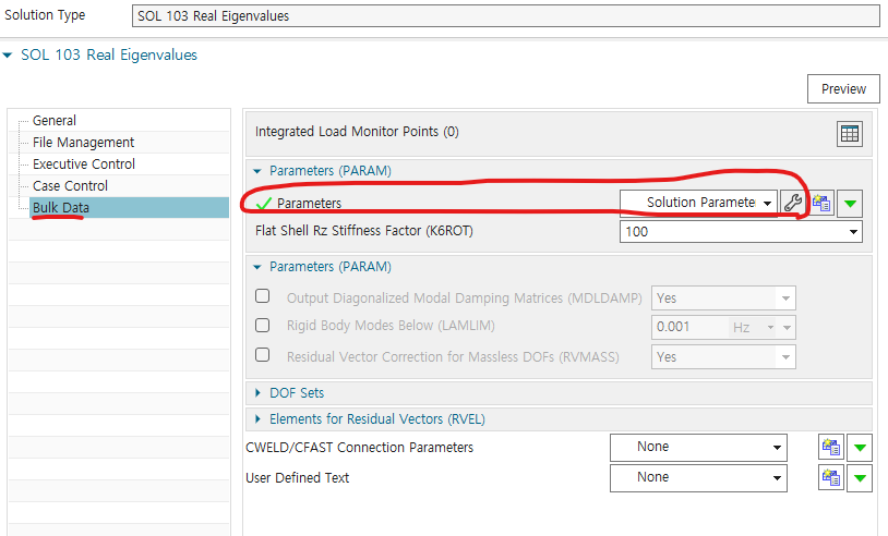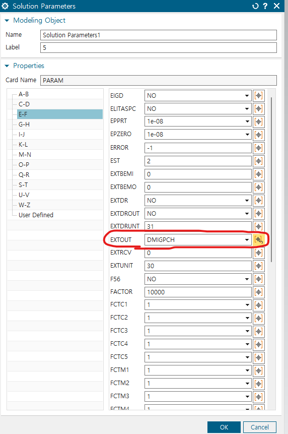 solution에서 103 Real eigenvalues -> param의 도구 -> extout option을 DMIGPCH로 바꾸기(E-F로 되어있는 것 중에서 찾아서 하기)