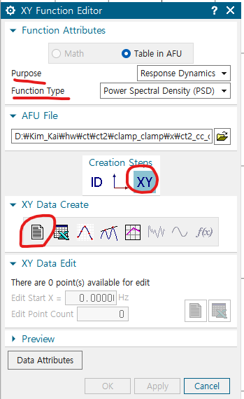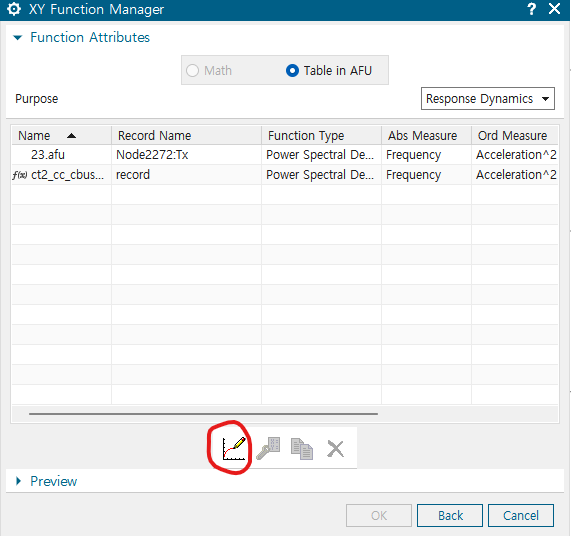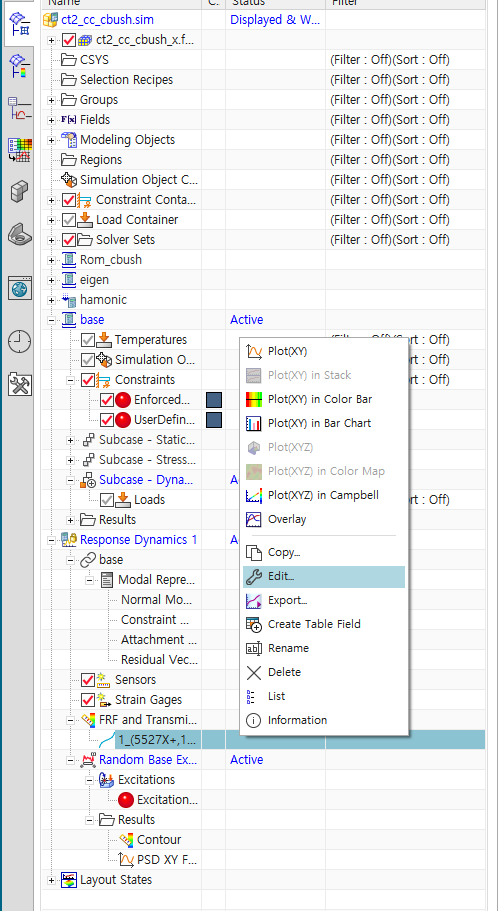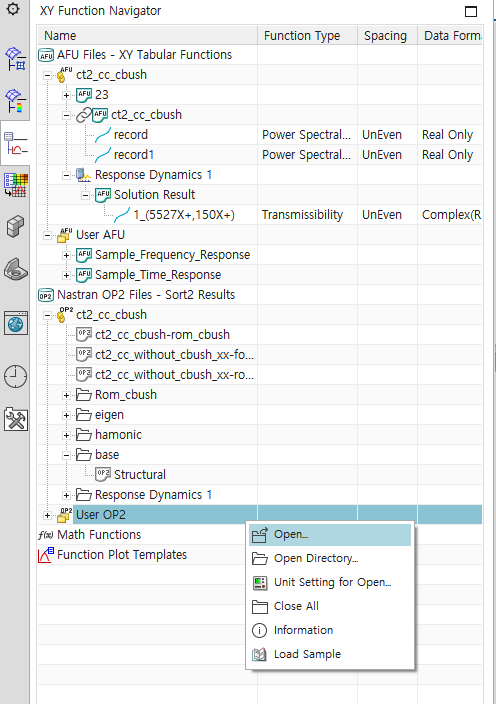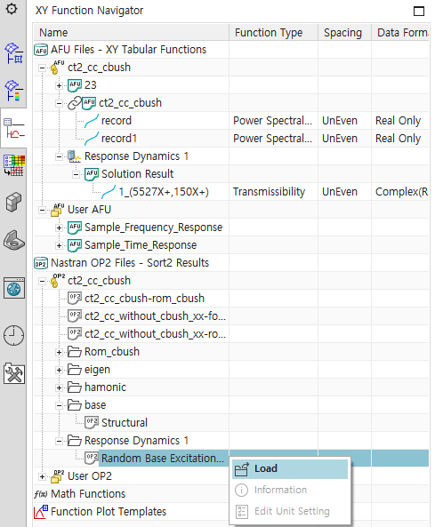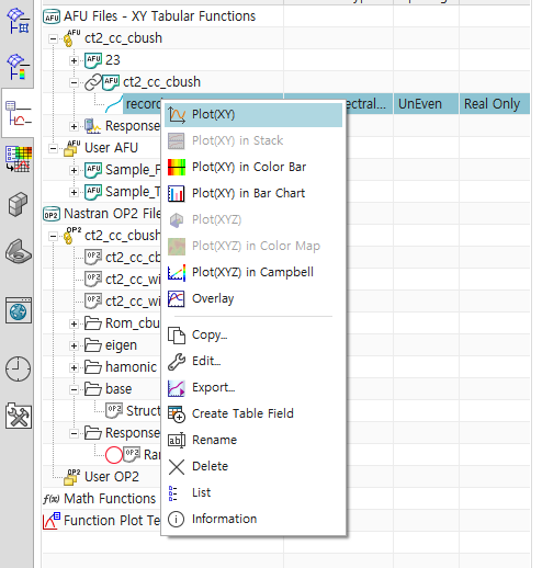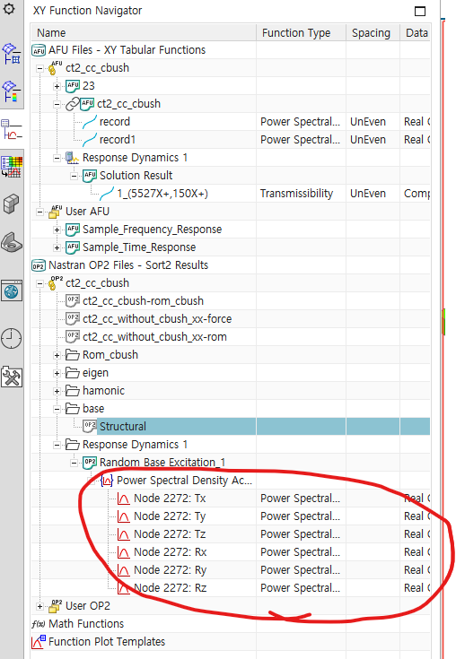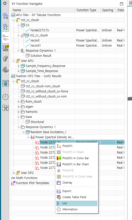 - 지정한 PSD Profile 확인하기 : XY Function Navigator의 ct2_cc_cbush(simulation 파일명) 하부의 record 우클릭 -> Plot(XY) -> Create New window