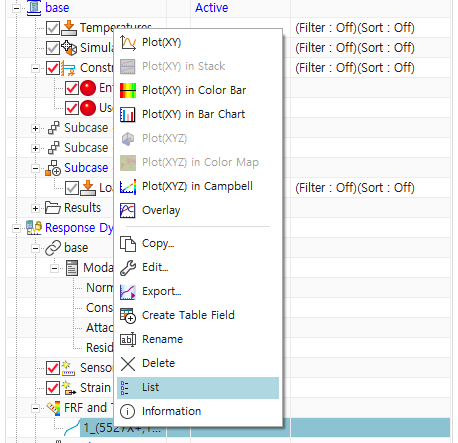 그리고 Response Dynamics 하부의 FRF and Transmissibility에서 결과 확인 가능- 해당 지점에 우클릭 -> Plot(xy)