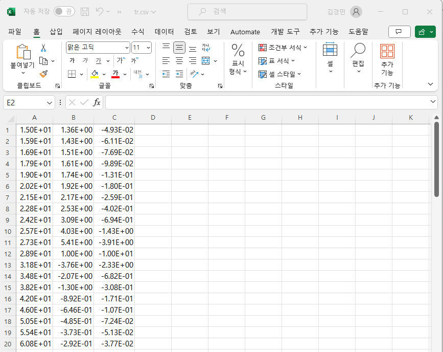 1열 : 주파수, 2열 : y 값의 Real part, 3열 Imaginary part