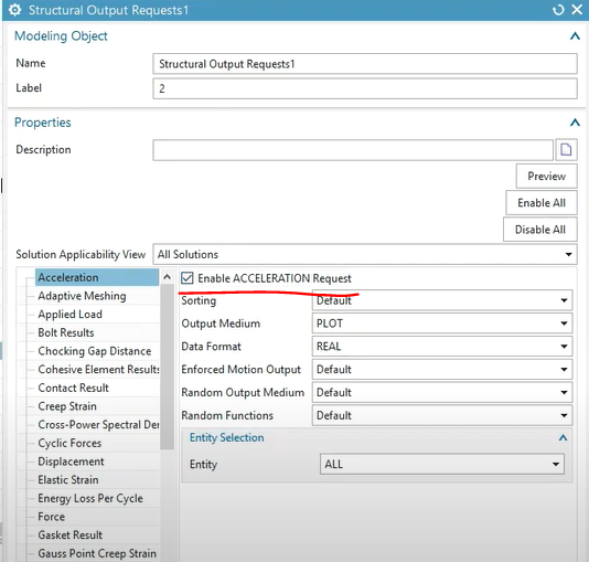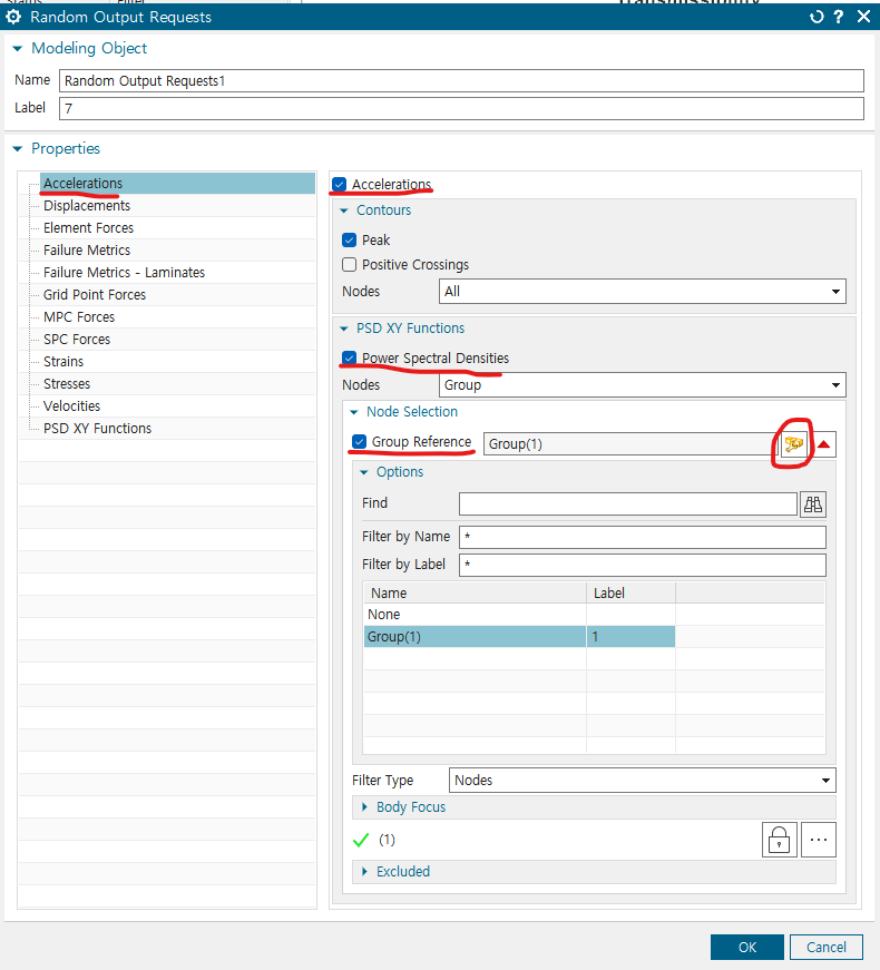 - 가속도 결과를 볼 것이므로 Acceleration에 들어가서, Acceleration, Power Spectral Densities 체크