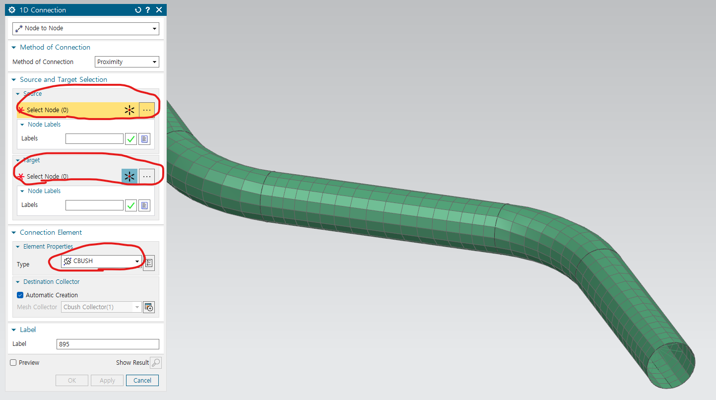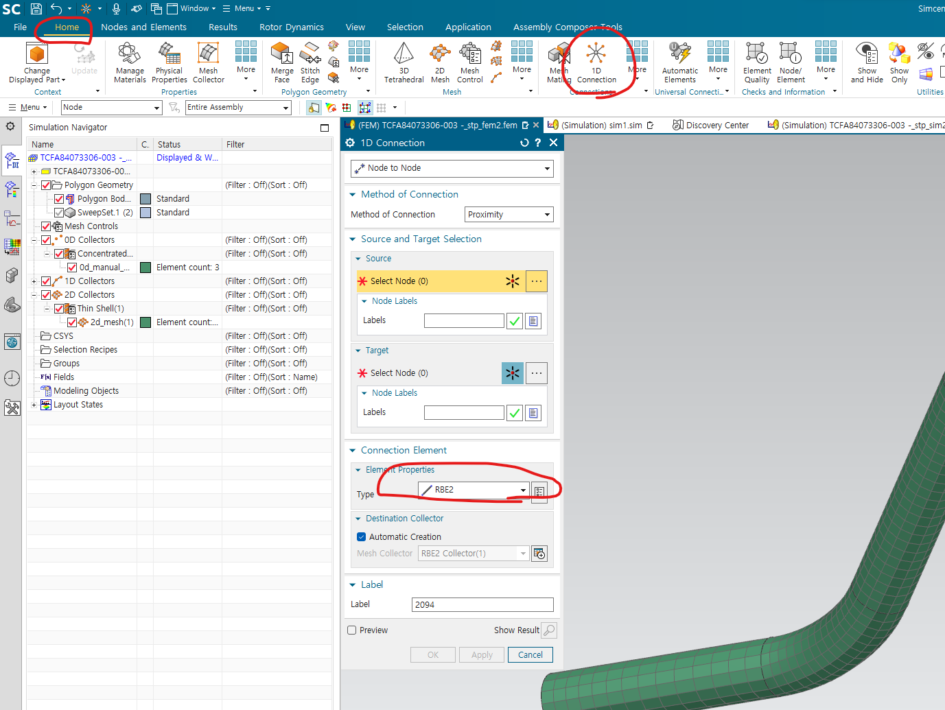-home -> 1D connection에서 RBE2 설정 , target, source 선택