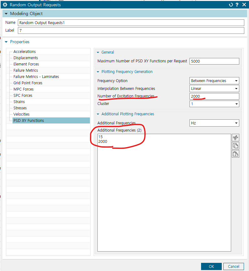 - PSD XY Functions의 Additional Frequency 입력 (PSD 지정했던 주파수 범위인 15~2000 Hz), Number of Excitation frequency 증가시키기, 해당 값이 커야, 그래프에서 Frequency 간격이 줄어드는 효과 발생