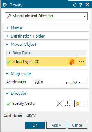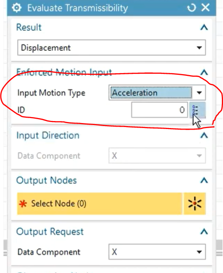 2) input motion type을 acceleration으로 선택, ID는 위에서 정한 base의 노드 입력(Enforced motion location이랑 fixed constraint를 가한 노드)