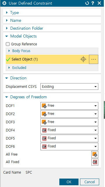 이때, 힘 F는 물체의 고정부에 가해지며, x 방향 힘인 경우, 해당 노드의 6 DOF 중 x transitional 성분에만 힘이 가해지는 것으로 하여 계산할 수 있다.