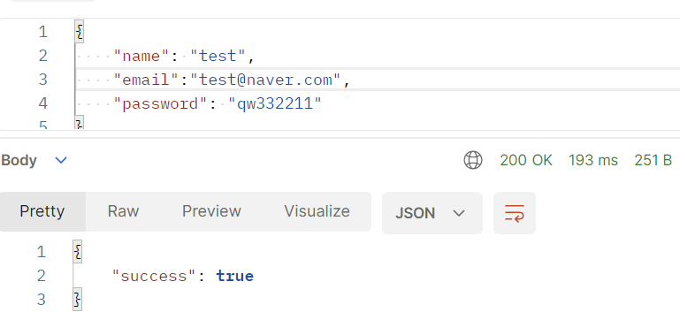 위의 사진은 전에 post로 이름, 이메일, 비밀번호를 서버로 보낸 것이다. 이렇게 개인정보들이 투명하게 보이니 보안에 위험이 있다. 그렇기 때문에 보낼 때는 저런식으로 투명하게 보내더라도 DB에 저장될 때는 암호화 되어서 저장하는 것을 해볼 것이다.