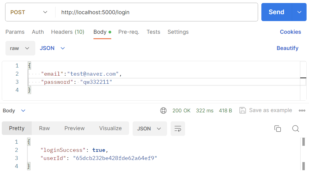 body에 이메일과 비밀번호를 넣고 Send 하면 아래에 결과값이 나타난다.