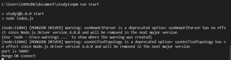 하단에 MONGO DB Connect는 MONGO DB가 잘 연결 되었을 때 나타나도록 하는 콘솔 메세지이다.