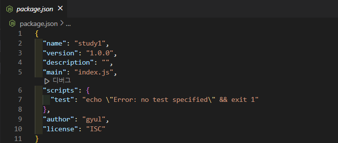 위 과정을 끝마치고 VSCode에서 study1 폴더를 열어보면 package.json이 생성된 걸 볼 수 있다.