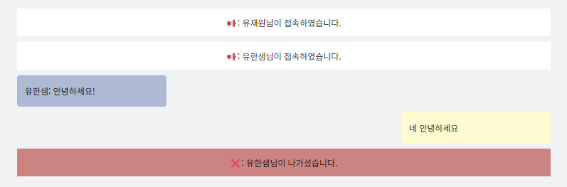 이 때 클라이언트는 세 가지 경우를 각각 메세지 색깔이 다르게 보여주도록, className을 다르게 분기처리했습니다.