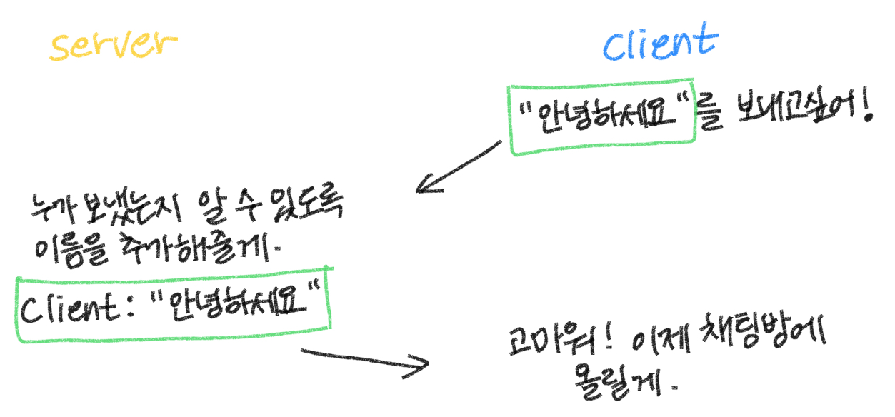 위에서 언급한 "oo님이 접속하였습니다."와 같이 서버에서는 서버와 클라이언트가 연결 되었을 때, 서버와 클라이언트의 연결이 끊겼을 때, 다른 유저가 메세지를 보냈을 때 세 가지 경우로 클라이언트에게 데이터를 넘깁니다.