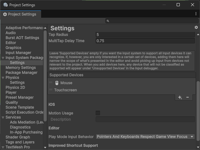 Input System Package>Settings에서 Create settings asset으로 에셋을 생성한 후, Supported Devices에서 사용할 장치를 추가한다.
