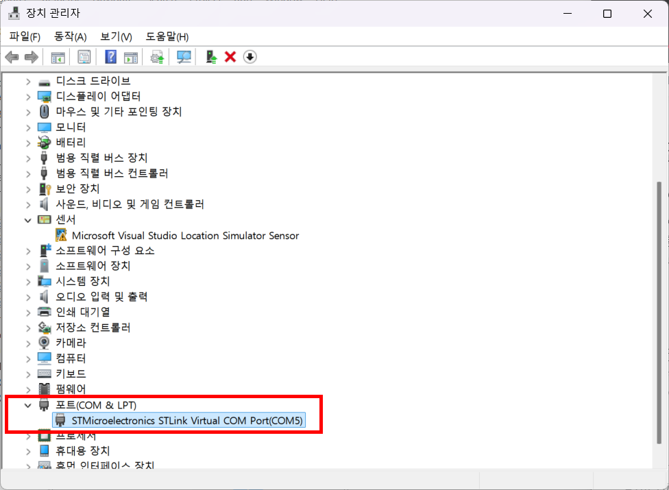 장치관리자에서 COM5에 연결되어 있는 것을 확인했다.