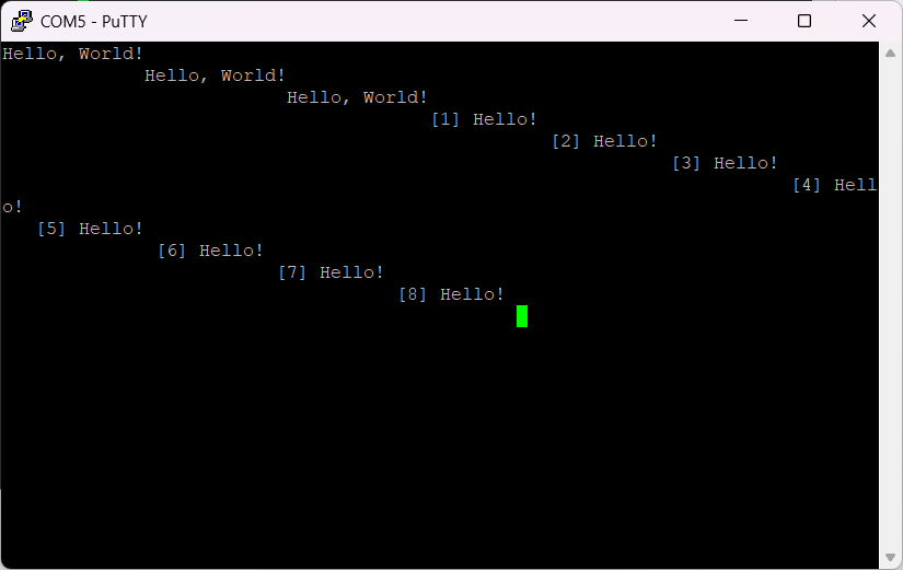 커서가 \n을 Line feed로만 전송하기 때문에 줄바꿈 위치가 출력 바로 아래이다. putty에서 CR+LF로 인식하게 하거나 CR도 보내주게 하면 된다. 그러나 귀찮으니 패스