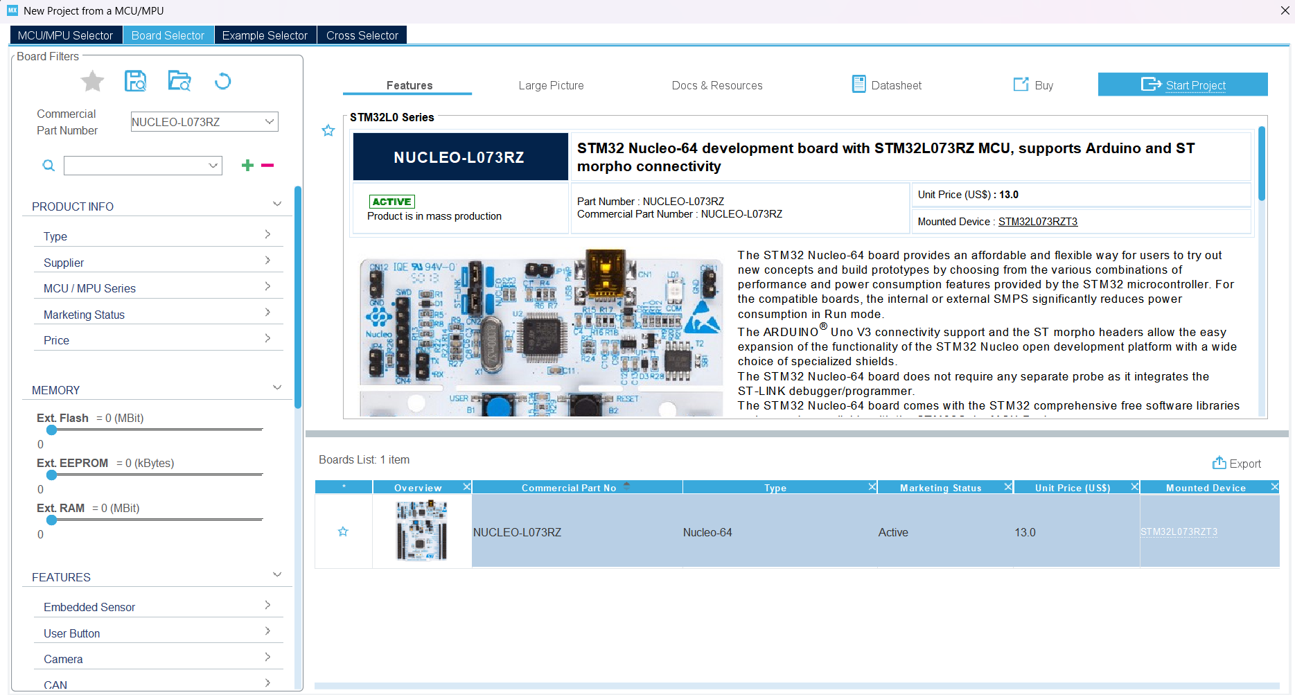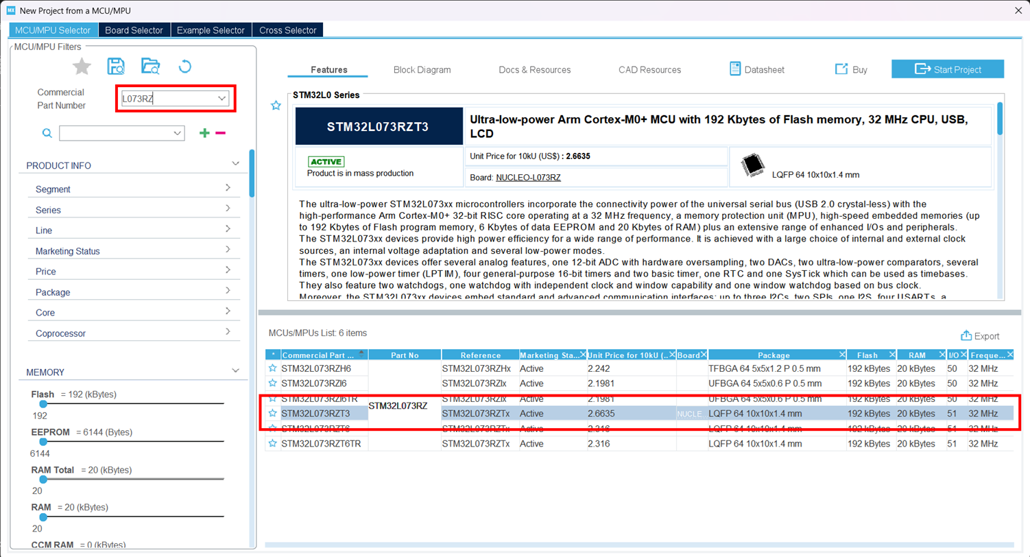 CubeMX를 켜고 보드에 적혀있는 L073RZ를 검색해주었다.