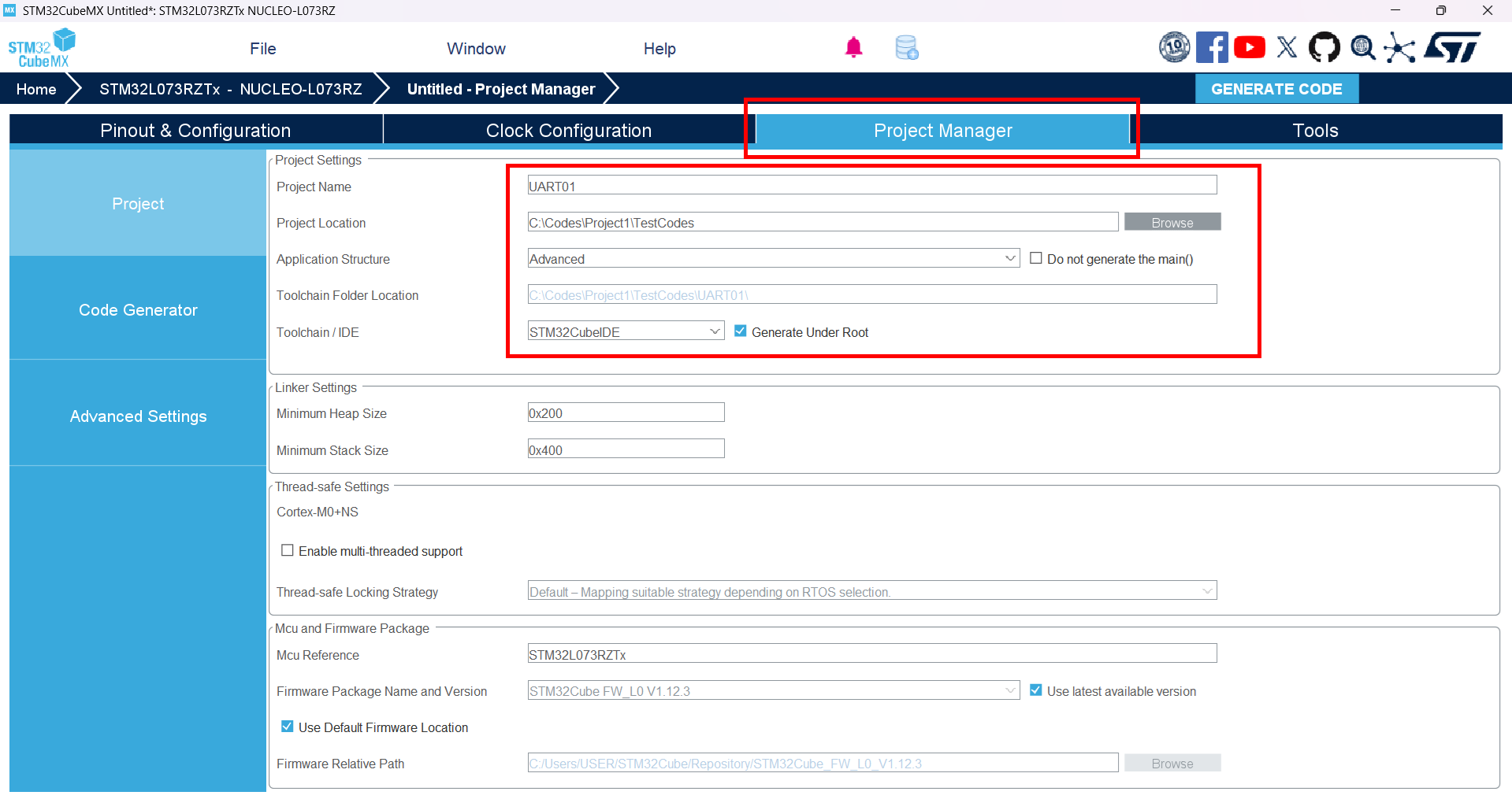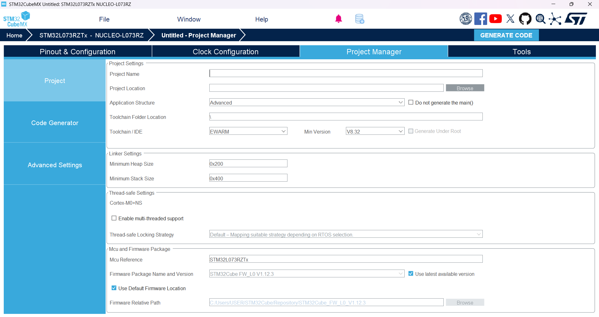 그리고 오른쪽 위의 GENERATE CODE를 누르면 프로젝트와 코드가 생성된다.