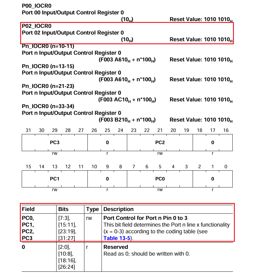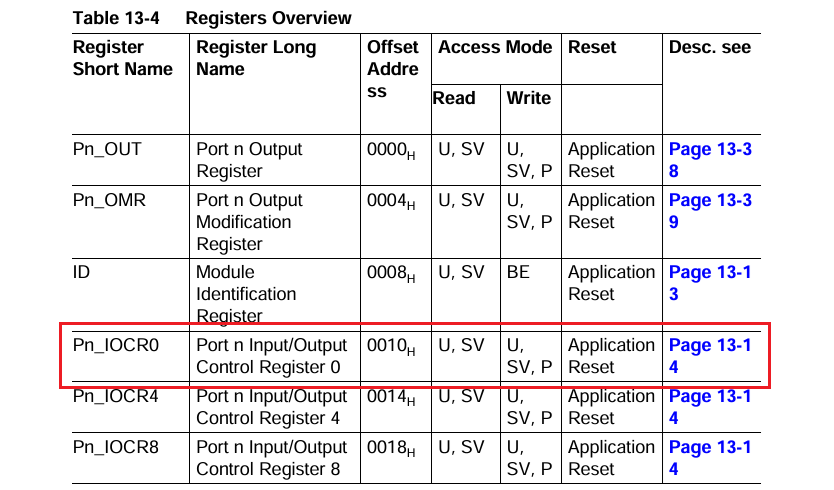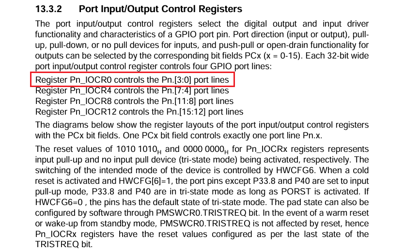 Pn_IOCR의 의미는 n번 Port의 Input Output Control Register의 약자이고, 이를 따라가 보면, Pn_IOCR0에서 Pn.[3:0]을 설정할 수 있다고 한다.