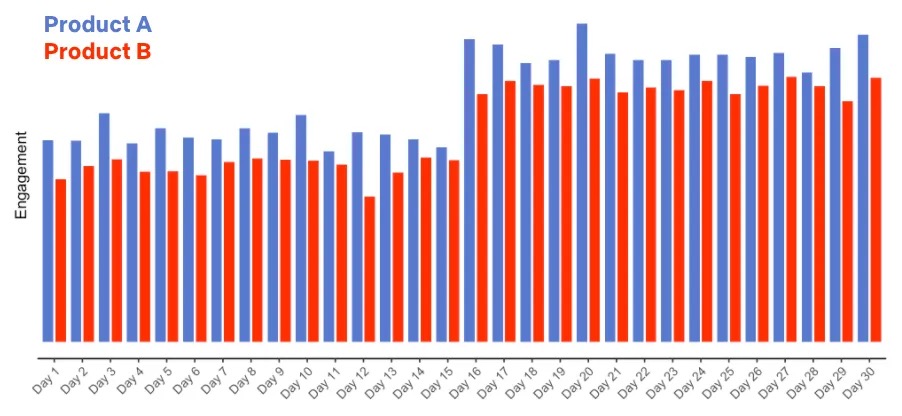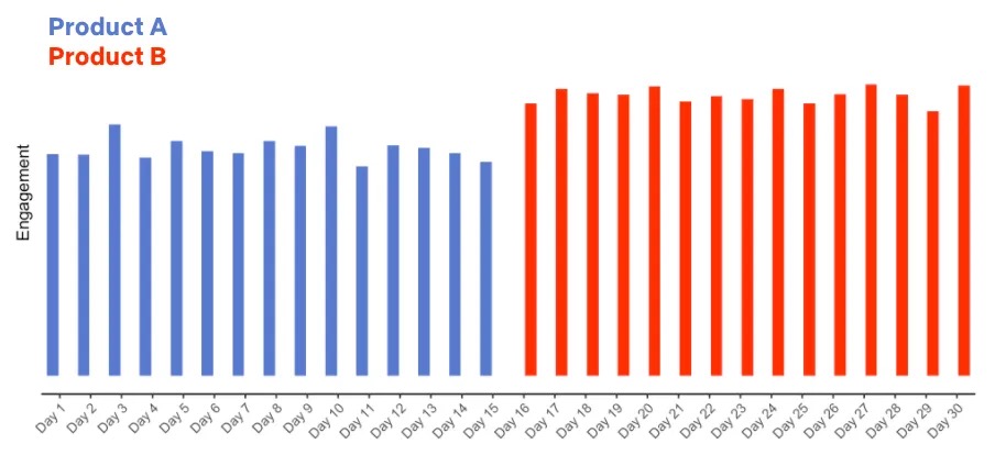⇒ 거꾸로된 UI(Product B)가 참여도 감소를 초래했을 가능성이 높다.
