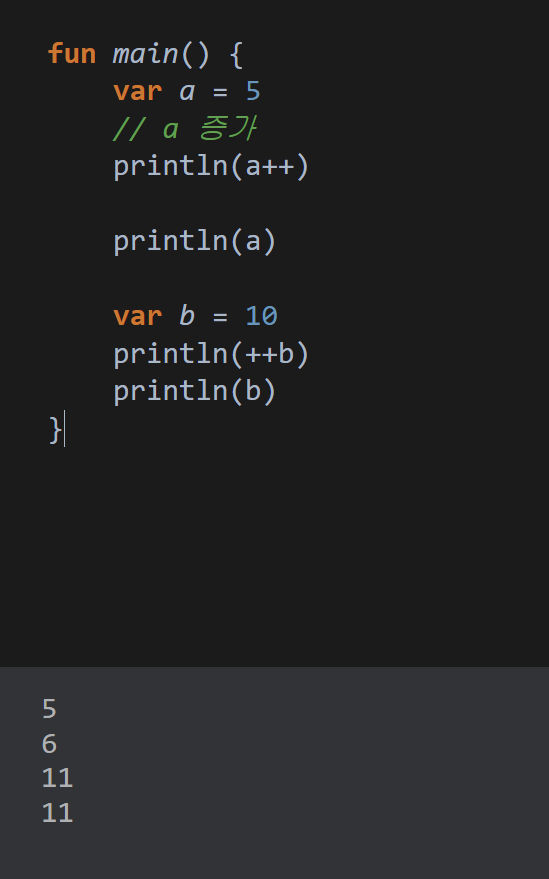 a++은 a = a + 1과 같다고 생각하면 되고, 후위연산자이기 때문에 실행 후 연산한다. 반대로 전위연산자는 b = b + 1과 같다고 생각하는 것은 전위연산자와 동일하나, 실행 전에 증가하게 된다.