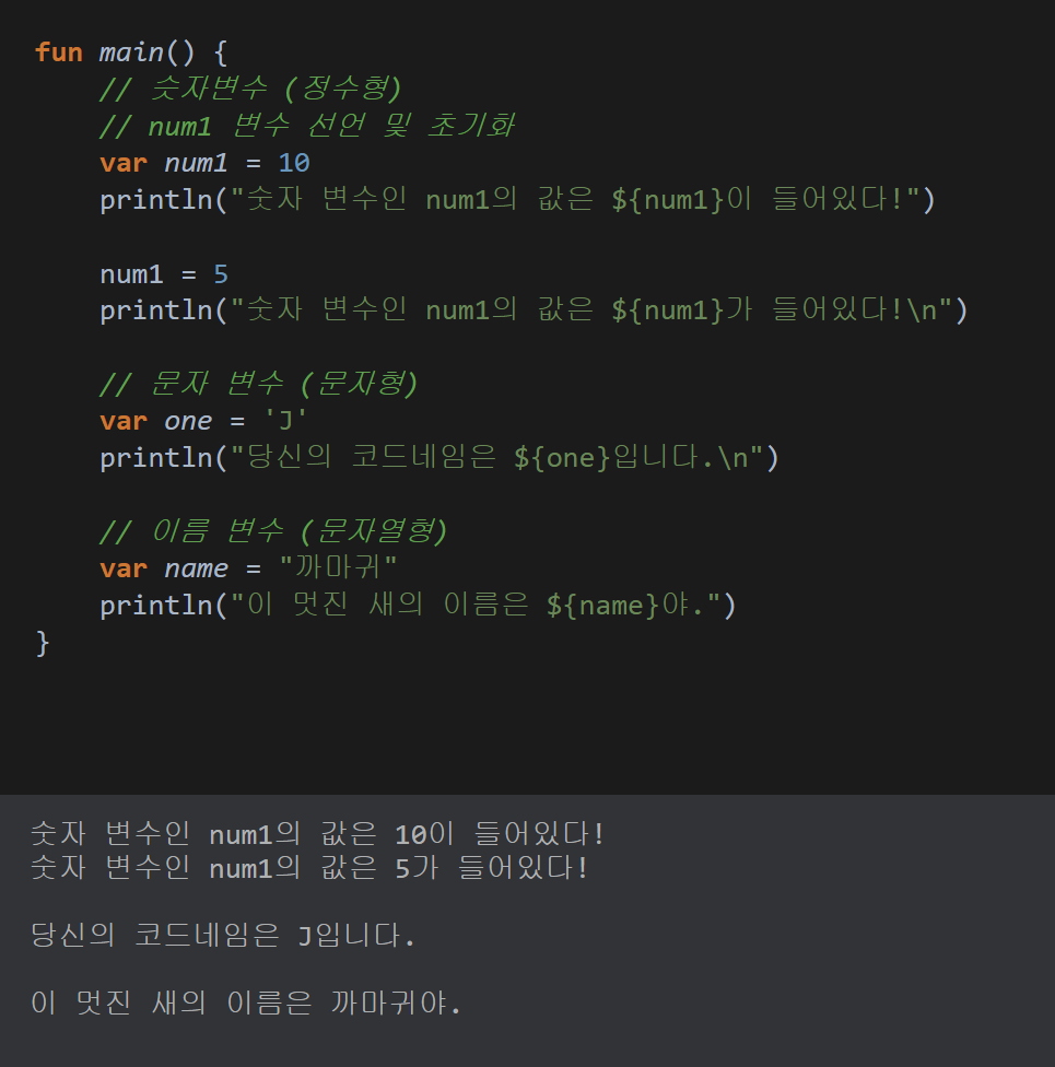 숫자 변수에서 num1이 이미 10으로 초기화 및 선언되어 있기 때문에 num1을 5로 지정할 때는 다시 선언할 필요가 없다.