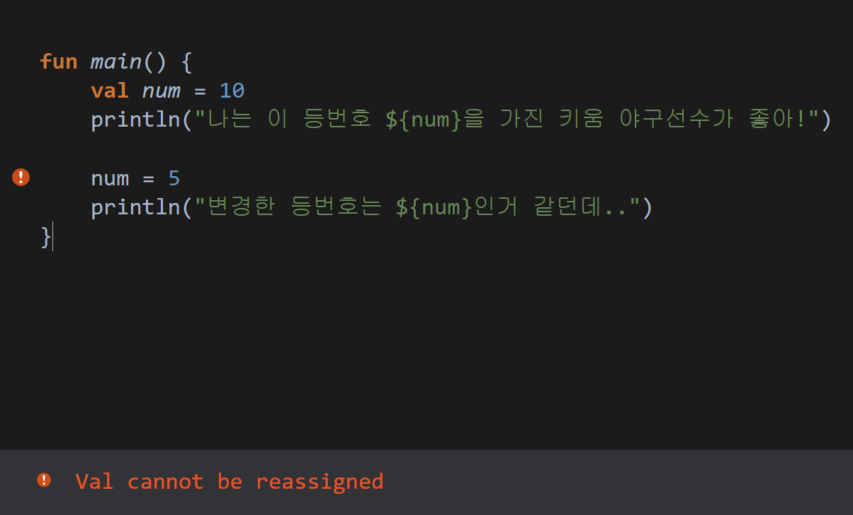 num은 이미 변수가 아닌 상수로 지정했기 때문에 불변하는 값을 변경하려고 하면 에러가 발생한다.