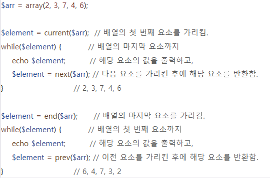 each(): 배열 포인터가 현재 가리키고 있는 요소의 키와 값을 연관 배열로 반환하고, 배열 포인터를 앞으로 하나 이동